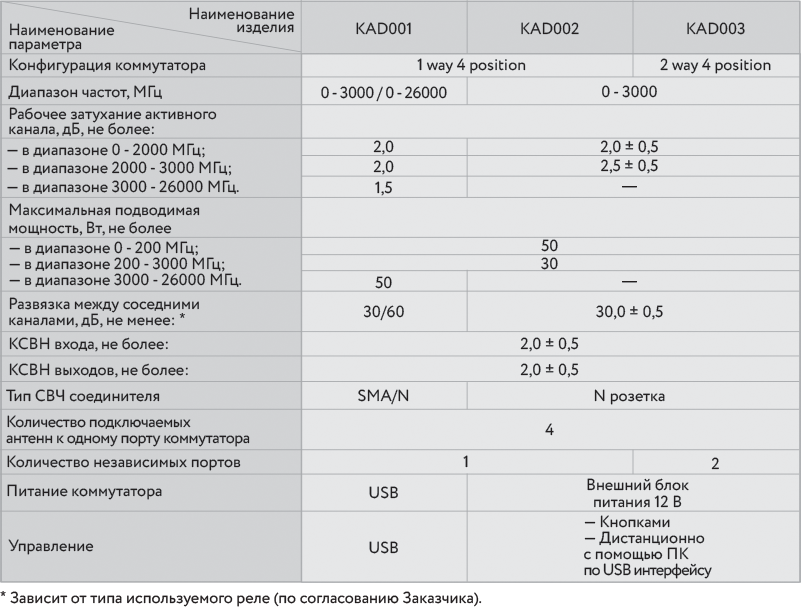 В качестве входов и выходов коммутатора используются коаксиальные СВЧ разъемы — с волновым сопротивлением 50 Ом N типа (розетка).