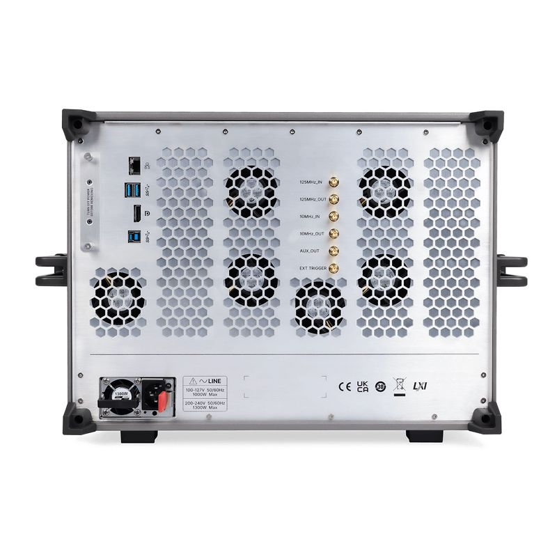 Для удобства работы прибор оснащён сенсорным TFT-дисплеем диагональю 17,78 см с разрешением 1024×600 пикселей и координатной сеткой 8×10 делений. Экран обеспечивает высокую контрастность и позволяет комфортно анализировать даже мелкие детали осциллограммы. На передней панели расположены интерфейсы USB 2.0 Host, выход калибратора (1 кГц, 3 В меандр), а также разъём SBUS для подключения MSO-пробника. Задняя панель содержит дополнительные интерфейсы — USB 2.0 Host/Device, сетевой порт LAN (RJ45), а также вспомогательные выходы синхронизации (3,3 В LVCMOS) и TTL (3,3 В). Такое оснащение делает прибор удобным для интеграции в автоматизированные системы измерений, подключения к ПК и удалённого управления.