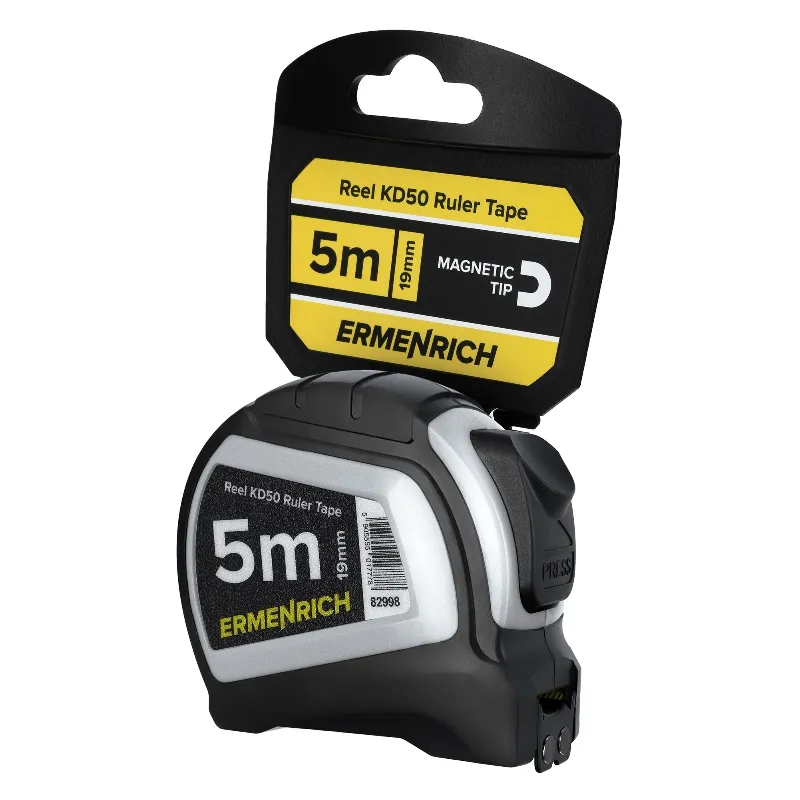 Ermenrich Reel KD50 - практичная строительная рулетка, рассчитанная на ежедневное использование и точные замеры в самых разных условиях. Прочное мерное полотно из матовой стали имеет чёткую разметку с одной стороны и позволяет выполнять измерения длиной до 5 метров. Лента рулетки устойчива к истиранию разметки, не бликует на солнце. Это всё делает работу с инструментом комфортной как в помещении, так и на улице, “в полях.