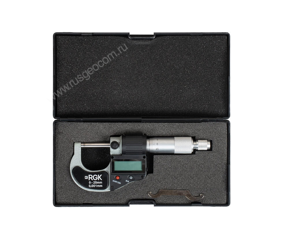 RGK MC-25 - высокоточный инструмент для измерения линейных параметров различных деталей и заготовок в диапазоне от 0 до 25 мм с разрешением 0.001 мм и допусками.