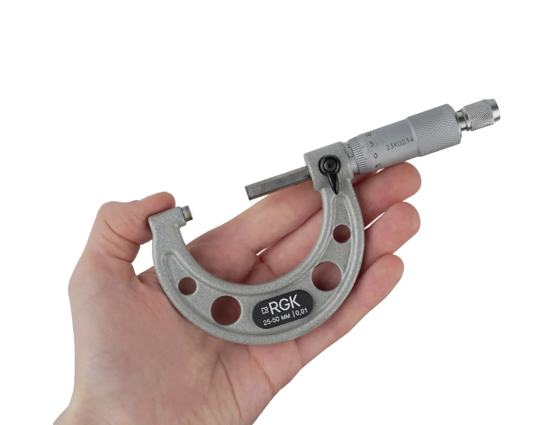 RGK MPM-50 – измерительный прибор с ценой деления 0,01 мм, предназначенный для контроля наружных размеров различных изделий в пределах от 25 до 50 мм.