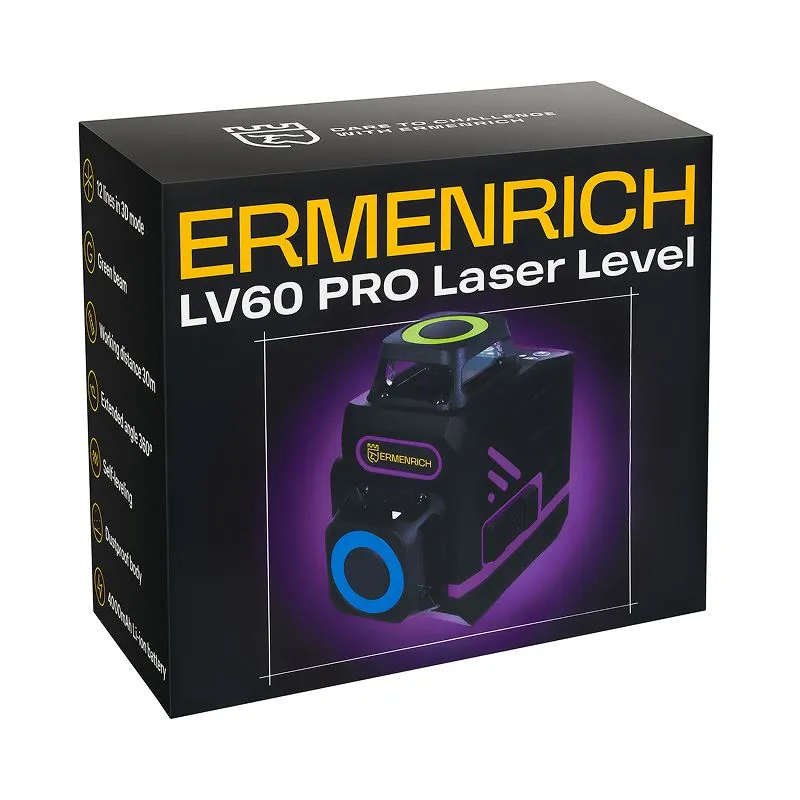 Лазерный уровень Ermenrich PRO LV60 — это точный профессиональный инструмент 3D-класса, который обеспечивает полное покрытие пространства и позволяет выполнять разметку с максимальной точностью. Прибор формирует 12 лазерных линий, что соответствует построению одной горизонтальной и двух вертикальных плоскостей, каждая из которых имеет угол развертки 360°. Такое решение позволяет создавать замкнутую сетку в трёх измерениях, обеспечивая идеальное выравнивание при строительных, монтажных и отделочных работах.